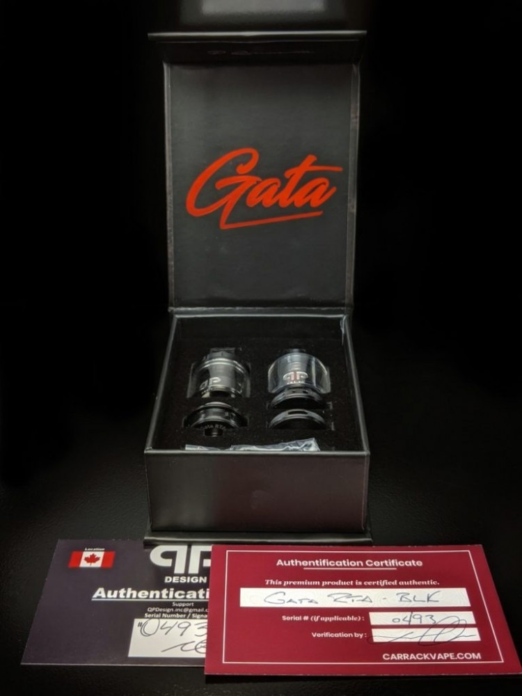 يمكن استخدام Gata RTA الجديدة بواسطة qp Design في vaping الحقيقي لـ MTL و DTL. يتميز هذا الخزان القابل لإعادة البناء بكويل واحد فقط ، وتصميم أقل لاحقًا مع براغي مثبتة على الجانب ومصنوع من الفولاذ المقاوم للصدأ عالي الجودة. تأتي Gata مع أقسام خزان 2x ؛ واحد لـ DTL والآخر لـ MTL vaping. الموفر عبارة عن خزان PMMA بسعة 2 مل وخزان زجاج بيركس بسعة 4 مل يتميز بغطاء علوي يسهل الوصول إليه وملء علوي ومداخن أطول للسماح بتدفق المزيد من الهواء حول الملف. يتم توفير Gata RTA مع 2x من رؤوس التنقيط Delrin السوداء لتشغيل MTL / DTL. بالإضافة إلى ذلك ، يتم تزويد Gata بحلقة تحكم في تدفق الهواء محددة MTL و DTL. في تكوين MTL ، يوجد مقيد تدفق الهواء Ultem 1.5mm. يتوفر Gata RTA باللون الأسود غير القابل للصدأ.